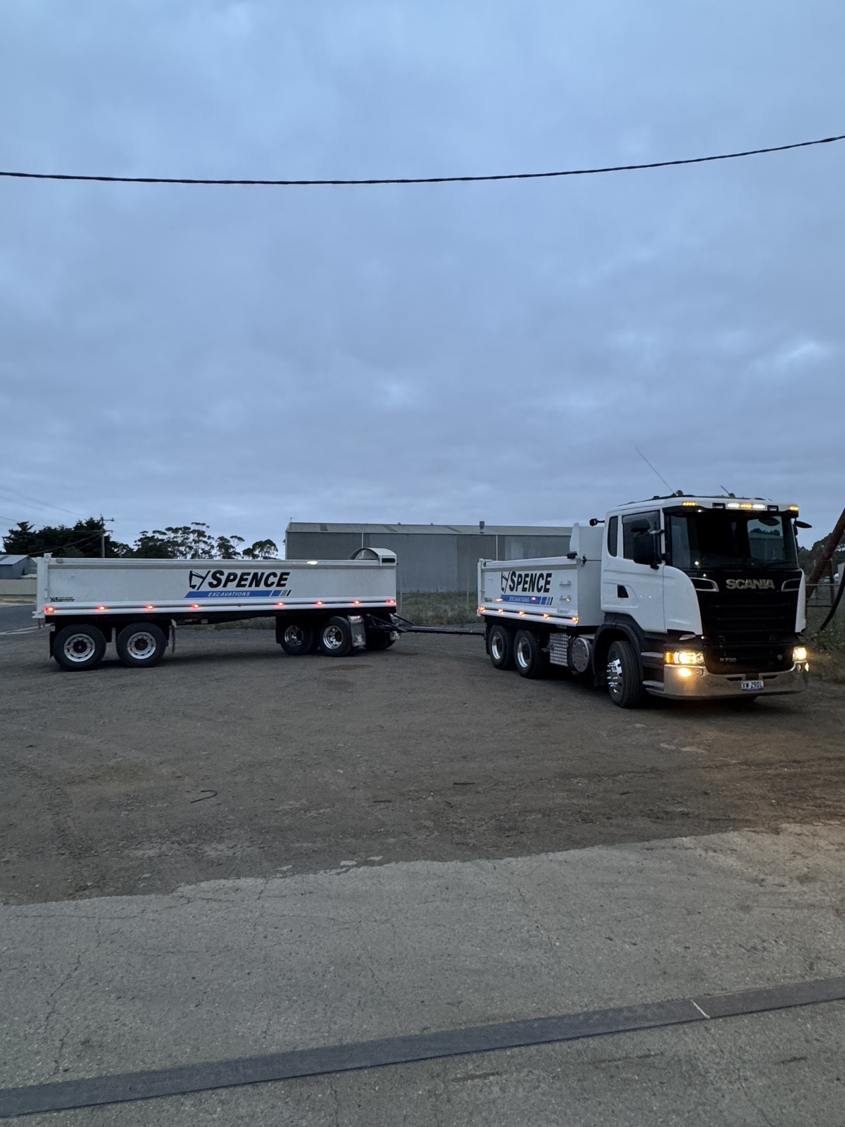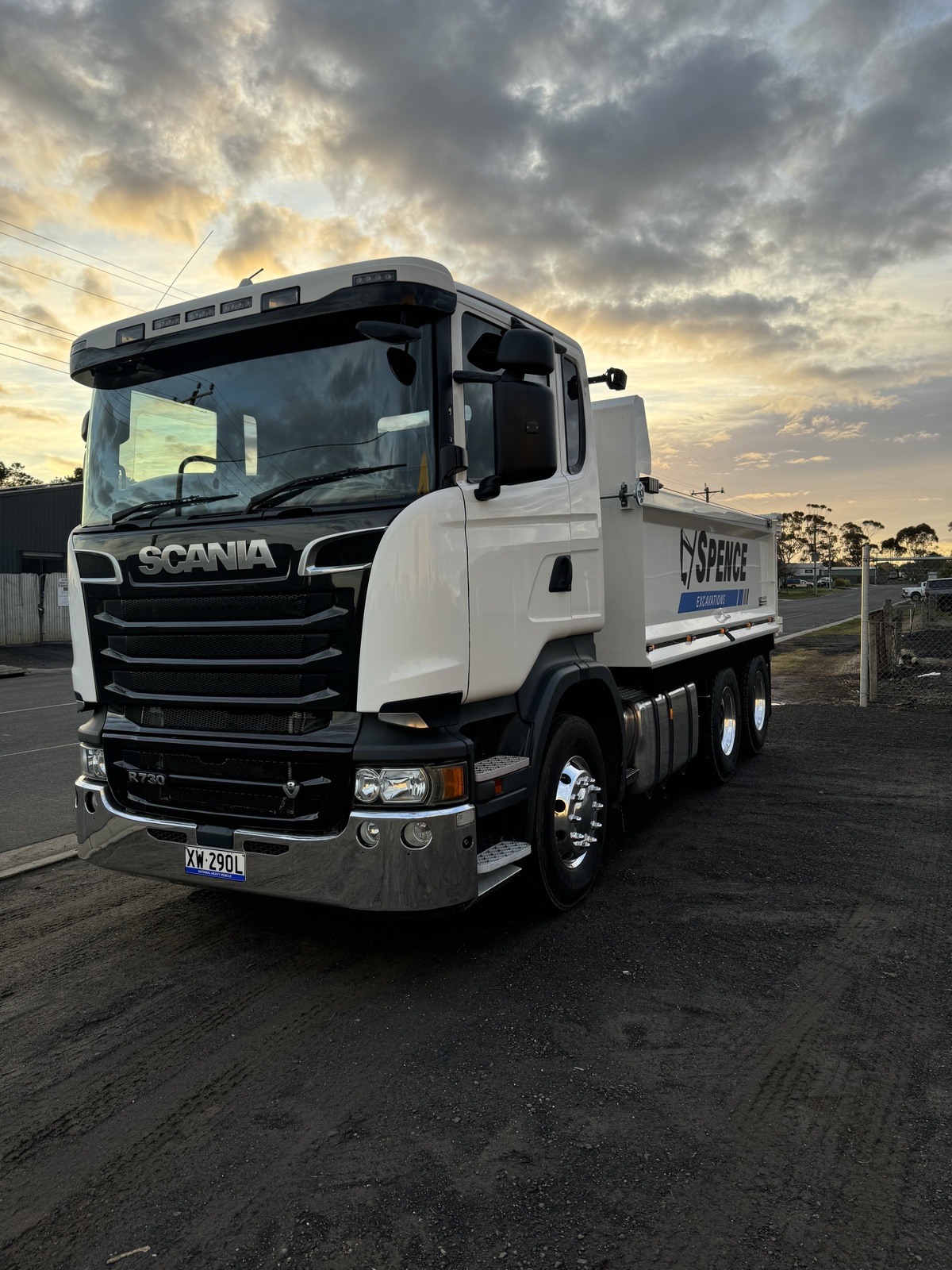 Scania R730 10m tip trucks with steel and alloy bins available. Trucks equipped with steel or alloy Tri-Axle and PBS Quad Dogs handling all your gravel cartage, rock haulage or spoil removal needs.