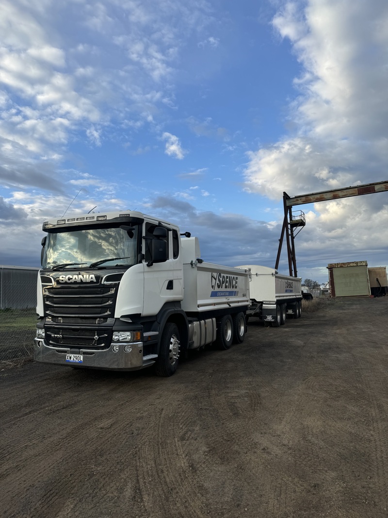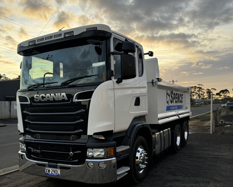 Scania R730 10m tip trucks with steel and alloy bins available. Trucks equipped with steel or alloy Tri-Axle and PBS Quad Dogs handling all your gravel cartage, rock haulage or spoil removal needs.